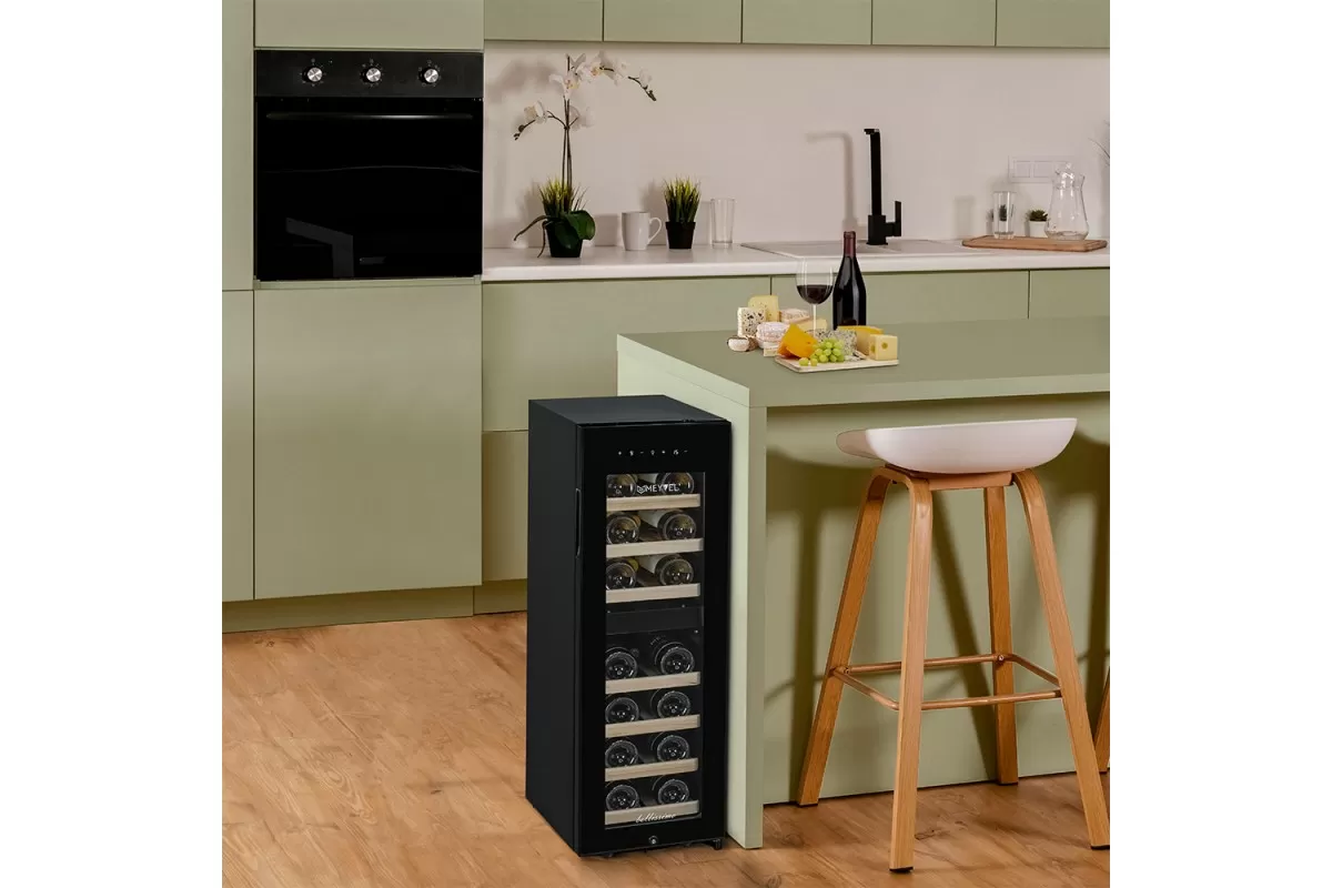 - Вместительность Несмотря на компактные габариты, модель вмещает достаточный запас бутылок и позволяет удобно расположить вино и другие напитки для повседневного использования и приёма гостей.